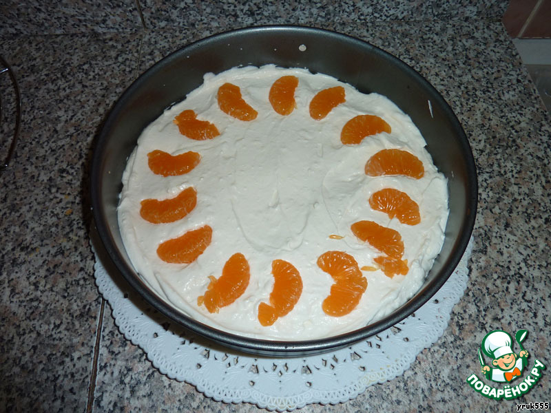 ... выливаем крем, разравниваем, выкладываем очищенные дольки мандарина.