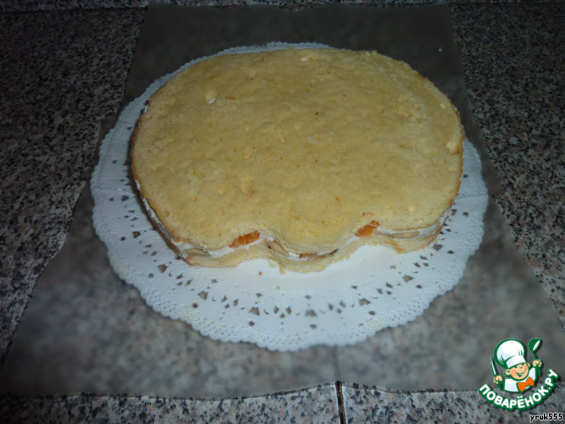 Сверху укладываем второй корж, слегка прижимаем от середины к краям, чтобы крем распределился равномерно и заполнил все дырочки.