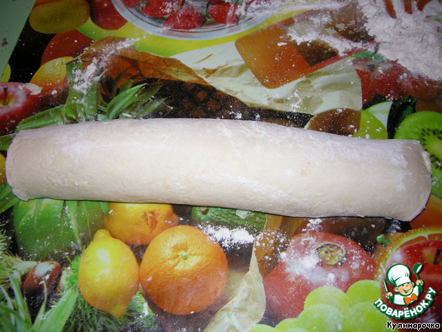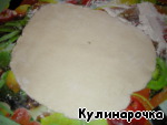 Тесто раскатать тонким пластом. Смазать приготовленным фаршем: в 200 грамм мясного фарша добавить соль, черный молотый перец и чеснок по вкусу.
