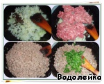 Лук почистить, порезать и обжарить на растительном масле (минут 5), после добавить к нему порезанный чеснок, обжарить чуть-чуть (буквально минуту). Добавляем сюда фарш и обжариваем его, хорошо перемешивая, пока фарш не изменит цвет. Снимаем с огня, немного остудить и добавить порезанную зелень, соль, перец, приправы по вкусу.