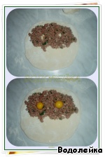 Дальше берем кусочек теста, раскатываем его в круглую лепешку. На одну половинку лепешки выкладываем фарш и делаем в нем как бы две дырочки (на фото видно) выливаем в эти дырочки перепелиные яйца.
