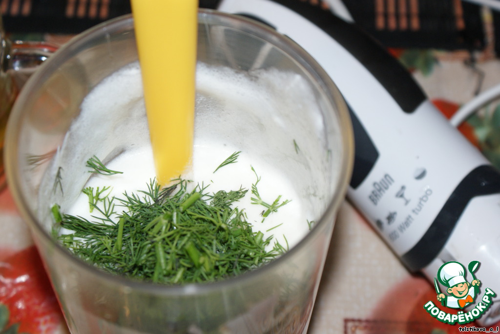 • Взбить 2 белка в крепкую пену, добавить в белки сметану, соль и порезанную зелень, перемешать.
