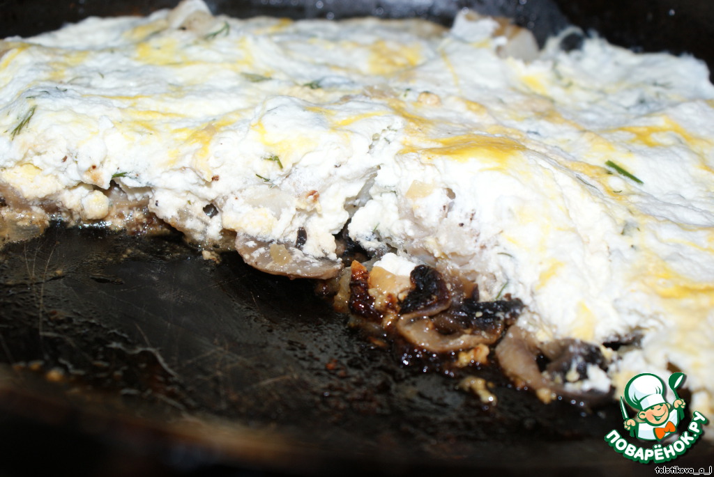 • Вылить заливку на рыбу с грибами, а из оставшихся двух желтков нанести сетку поверх заливки. Оставить на небольшом огне минут на 20.
