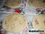 Каждый шарик раскатать в одном направлении для получения овальной формы. Грудинку или сало мелко нарезать и вдавить по несколько кусочков в каждую лепешку.