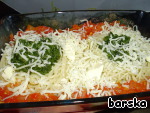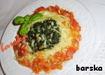 Заполнить гнёзда внутри шпинатной массой, а по бокам - выложить томатно-луковый соус. -