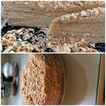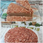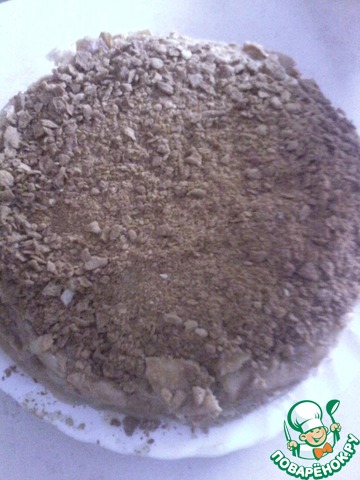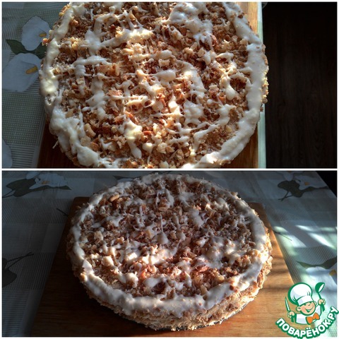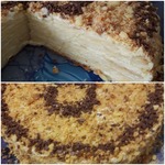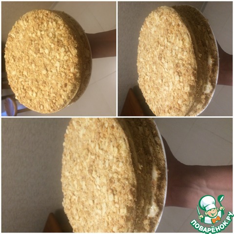 Крем получается очень пышный, нежный, воздушный. Коржи промазать ТОНКИМ слоем крема и сложить в стопку. Обрезки измельчить и посыпать сверху. Немного крошек оставить.