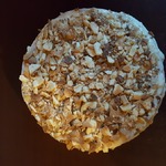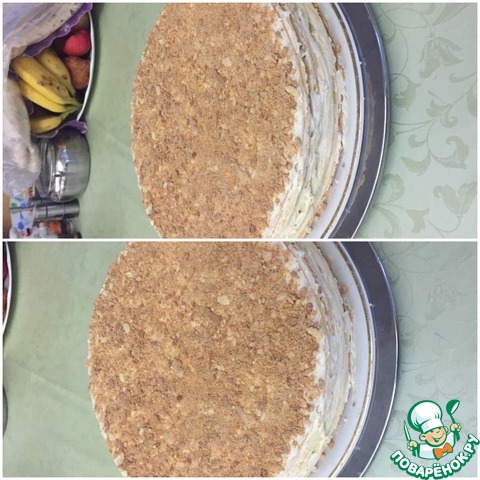 Накрыть доской и аккуратно поставить сверху небольшой гнет. У меня 2-литровый чайник с водой. Так оставить на ночь. Утром груз снять. Торт осядет. Крошку сверху слегка разрыхлить вилкой. Крем немного выдавится по бокам, размазать его и обсыпать бока крошкой.