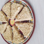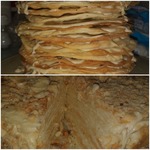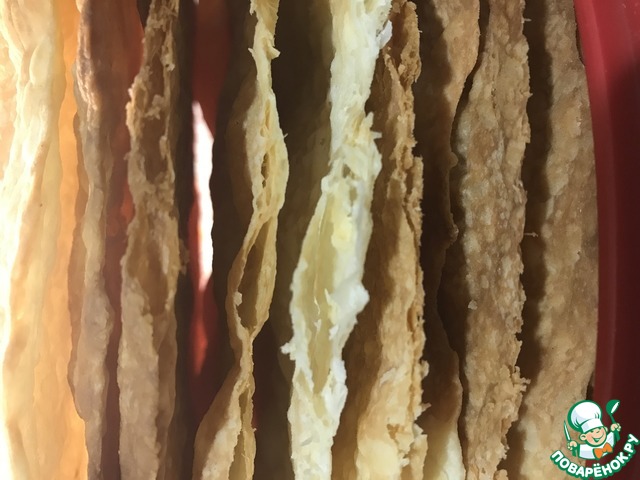 Тесто разделить пополам и каждую часть - на 7 кусочков (всего 14 кусочков). Раскатать очень тонко. Тесто очень благодарное, раскатывается легко и не рвется. Наматывать его не скалку нет необходимости. Переложить тесто на чистый, сухой противень, расправить.