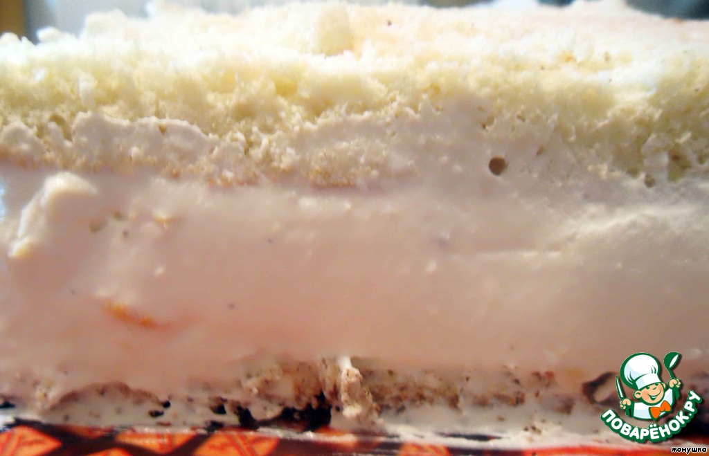Белый бисквит разрезаем на две части, пропитываем сиропом и выкладываем творожно-сливочную массу, накрываем вторым коржом и отправляем в холодильник для застывания.