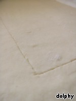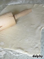 Тем временем немного раскатайте каждый пласт теста. Можно и не раскатывать. Разрежьте каждый пласт пополам.