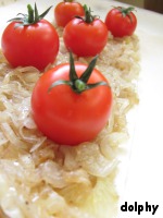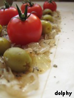 Выложите на тесто лук, не заходя за пределы рамки. На луке разместите помидоры. Я брала их чуть больше, чем требуется по рецепту.