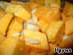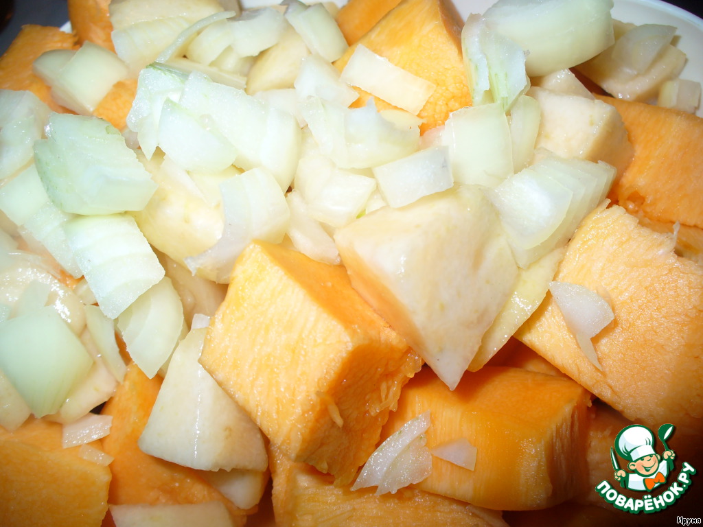 Мякоть тыквы и груши режем достаточно крупными кубиками, лук - мелкими.