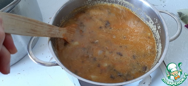 Грибы добавить к луку и моркови, посолить, поперчить и тушить до исчезновения жидкости.