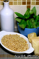 Базилик, орешки, головку пармезана, 4 дольки чеснока, крупную соль и оливковое масло. -