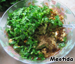 кинзу, орехи и чеснок измельчаем, соединяем с луком, специями и гранатовым соком.