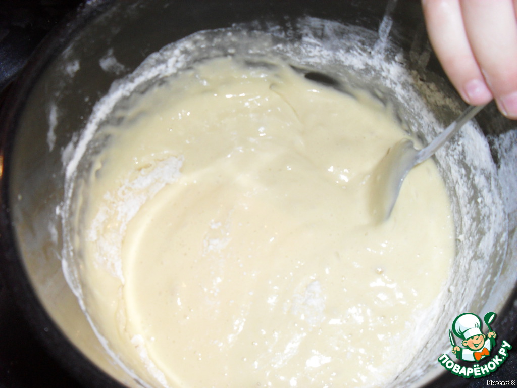 Во взбитые яйца добавляем муку, ванилин, разрыхлитель теста и соду, гашенную уксусом, тщательно все перемешиваем. |