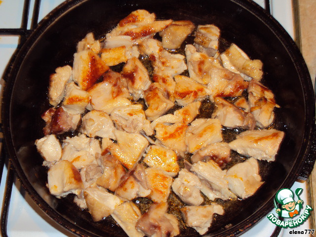 Филе куриное нарезать на кусочки и обжарить на растительном масле.
