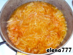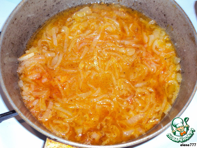 Добавить в лук томатный сок, белое вино, корицу, перец, шафран, щепотку сахара и томить 2-3 минуты.
