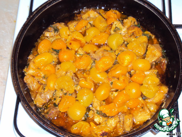 Потом добавить выдавленный чеснок, петрушку (у меня была замороженная), перемешать, сверху выложить половинки абрикосов, полить их образовавшимся жиром и томить ещё 5 минут. -