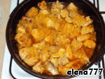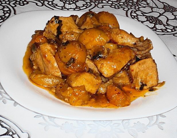 Рецепт этого блюда был размещeн на сайте в 2008 году пользователем elena_110 под названием "Куриный гуляш с абрикосами" и иллюстрирован мной в рамках акции "Раскраски". Замечательный рецепт! Готовится несложно, получается прямо-таки изысканный нежный гуляш с ароматом корицы и абрикосовой ноткой! Моим очень понравился. Подавать можно с любым гарниром. Огромное спасибо автору - моей тeзке за такой прекрасный рецепт гуляша!