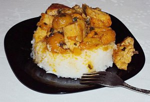 В этот рецепт я внесла небольшие изменения: добавила шафран, вместо томатного сока - соус и абрикосы я выкладывала сверху, не перемешивая, за 5 минут до готовности.