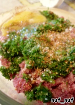 Петрушку, только листочки, и 1/4 луковицы безжалостно измельчить и, вместе с яйцом и приправой, добавить к фаршу. Посолить.