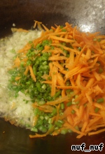 Оставшийся лук и стебли петрушки мелко нарезать. Морковь натереть на крупной тёрке.