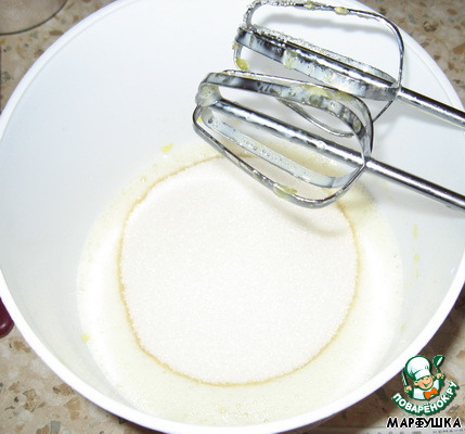 Берем четыре яйца и желток от пятого. Взбиваем. Добавляем 100 г сахарного песка.