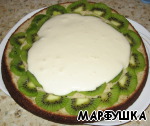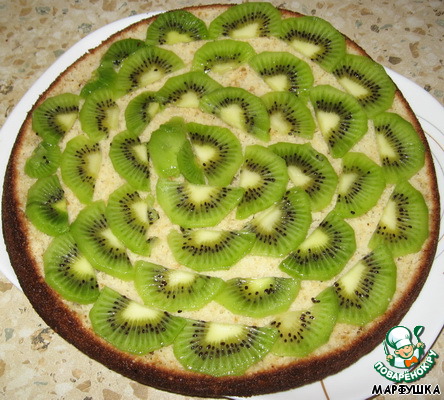Бисквит разрезаем пополам. Выкладываем на нижнюю часть дольки киви.