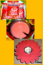 Коричневый пудинг в воде. На него переложила жёлтый пудинг. Затем розовый.
