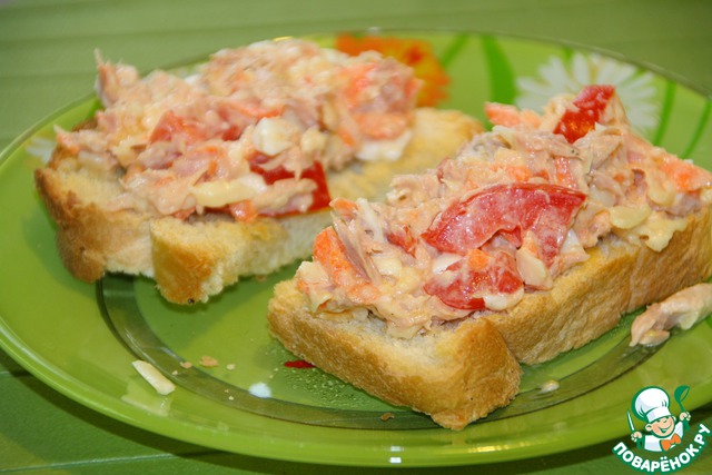 Тунец смешать с мелко порубленными яйцами, сельдереем и майонезом, и тоже выложить на брускетту.