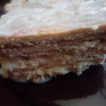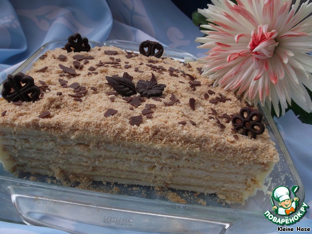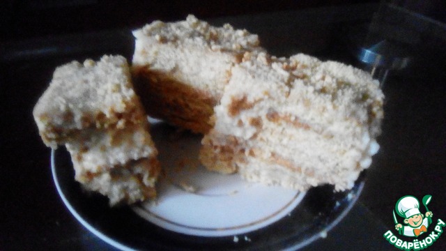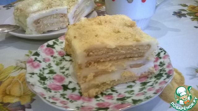 В торте использовала постное печенье (оно менее сладкое), не много уменьшила сахара в креме (по вкусу), масло заменила молочным маргарином (масло не любит свекровь), и сверху крема (последний слой крема) я полила топленным шоколадом.