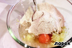 Капусту измельчить в блендере. Или в мясорубке. Можно и нарезать тонко... (так в рецепте сказано), но... не знаю - пропечется ли? К капусте добавить ржаную муку, яйца, соль, перец, половину порции воды.