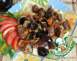 Предлагаю Вам попробовать это очень вкусное мясо. Готовится легко, а вкус получается праздничный за счeт присутствия чернослива. Обязательно буду готовить ещe не один раз. Рецепт этого блюда был размещeн в 2008 году пользователем Ленок под названием "Говядина, тушеная с черносливом" и иллюстрирован мной в рамках акции "Раскраски".