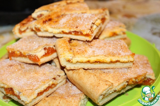 Курагу залить кипятком минуты на 2. Затем слить воду (оставив немного этой жидкости - примерно полстакана - может пригодиться, если начинка получится слишком густой). Размоченную курагу прокрутить через мясорубку и смешать с 1 стаканом сахара.