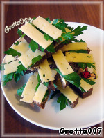 На полученные мини-бутерброды выкладываем под углом 60 градусов следующие 2 хлебных бруска. Также украшаем петрушкой и накрываем сыром.