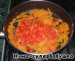 Лук и морковь спассеровать на оливковом масле, добавить перец и потушить до мягкости.