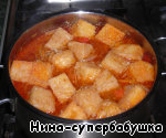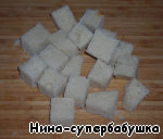 С хлеба срезать корку, мякиш нарезать кубиками со стороной 2 см.