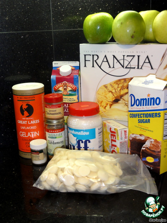 Разбавить пакетик лимонного желе в подогретом вине, добавить яблоки - поставить застывать в посуде нужного размера.