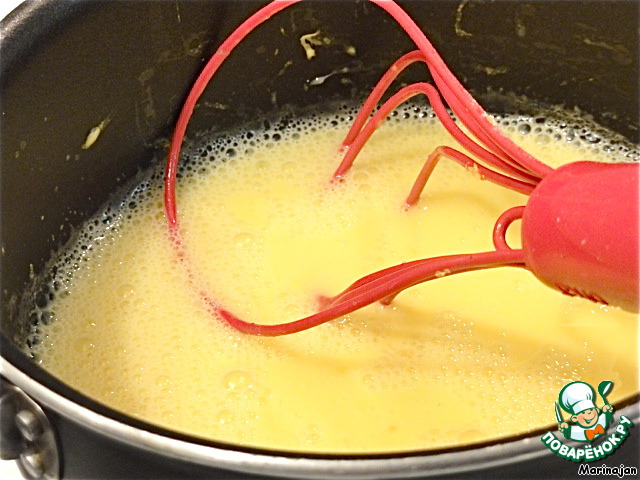 Желтки, сахар, вино, желатин, лимонный сок и цедру - довести на водяной бане до 82 град. - то есть до небольшого загустения.