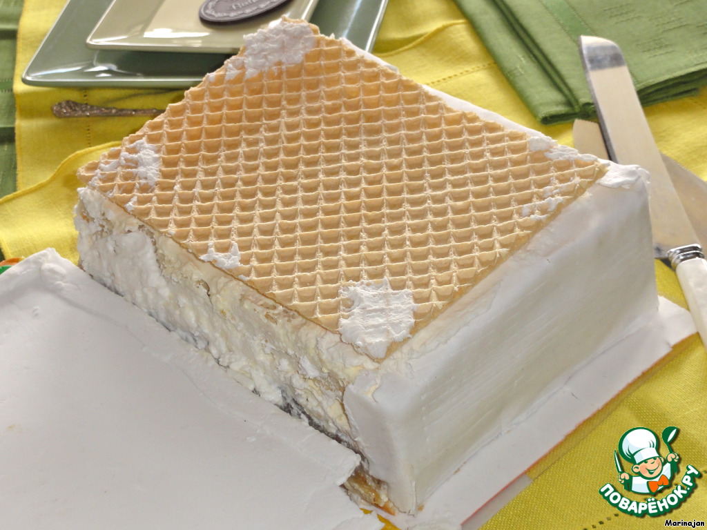 Верхняя обложка уже твердая, и края справа не опадут. Чтобы верхняя обложка не обмякла от крема, я подложила вафельный лист. Сделать дополнительную левую боковину. Приклеить ее белком.