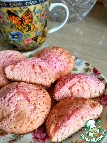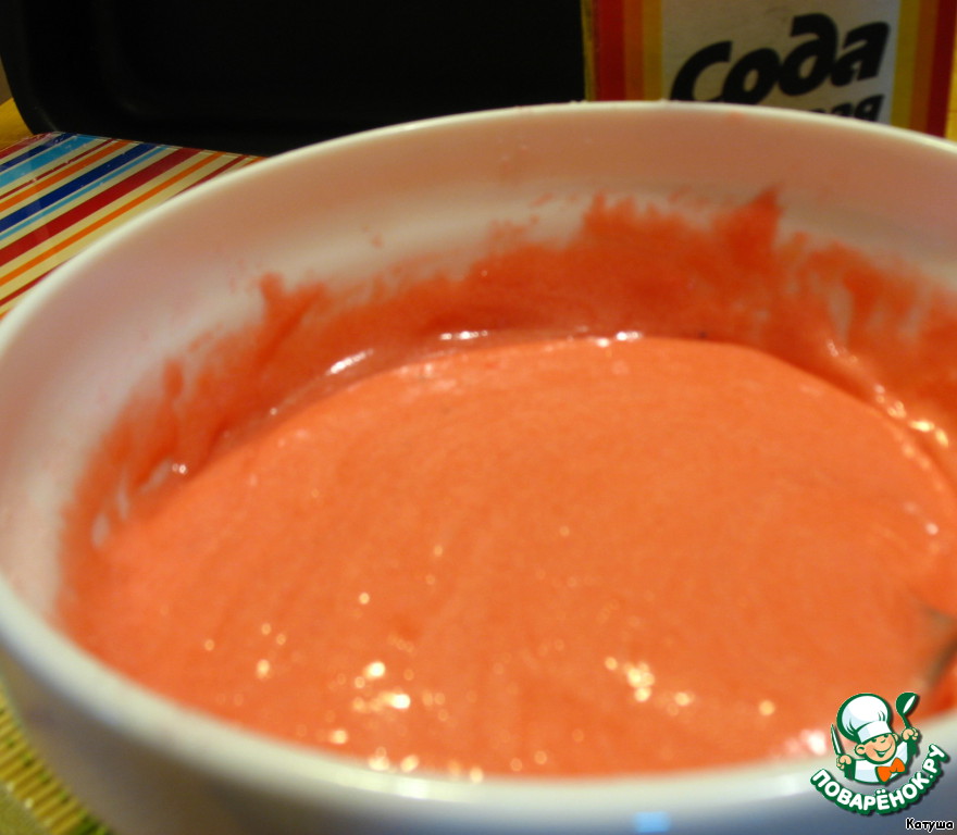 В моём случае - рассыпчатый кисель, земляничный, смешать с мукой. Я бы, в отличии от автора, сразу добавила соду или разрыхлитель, а не стала бы гасить отдельно, т. к., в киселе есть лимонная кислота и сода бы сама погасилась в тесте, но... делала всё по рецепту.
