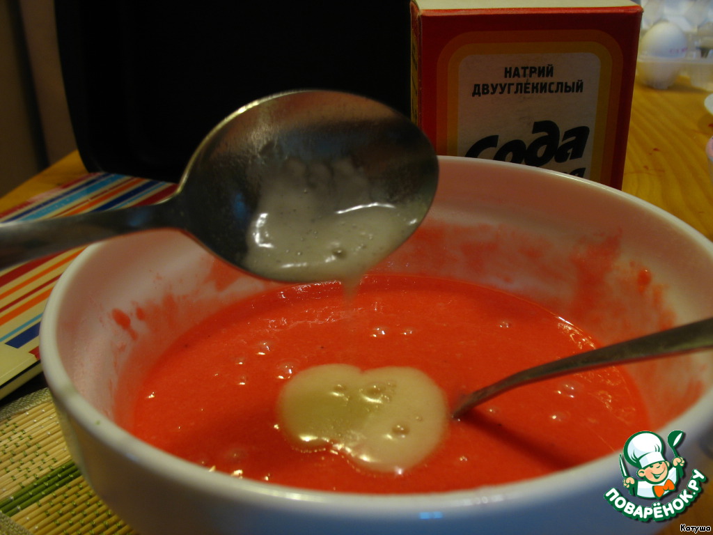 Вводим гашёную соду. Как писала выше, разрыхлитель положила бы сразу в кисель, но... делала всё по рецепту.