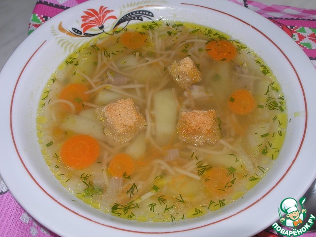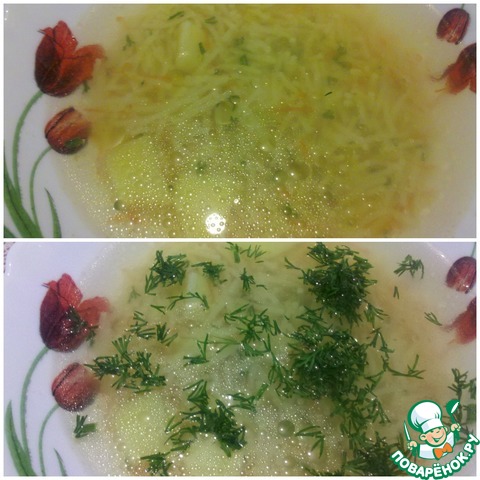 Затем удалить из бульона луковицу, добавить лавровый лист и всыпать вермишель. Тончайшая Паутинка" варится 5 мин.