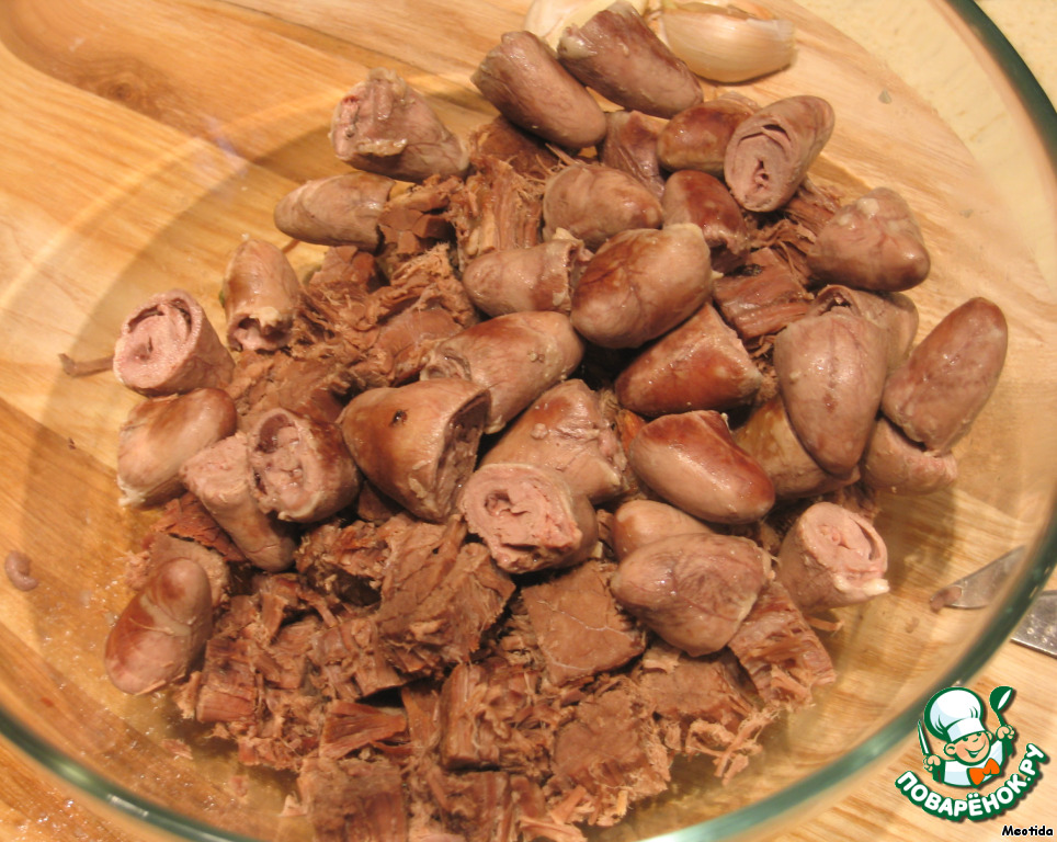 Куриные сердечки и говядину необходимо отварить.
