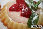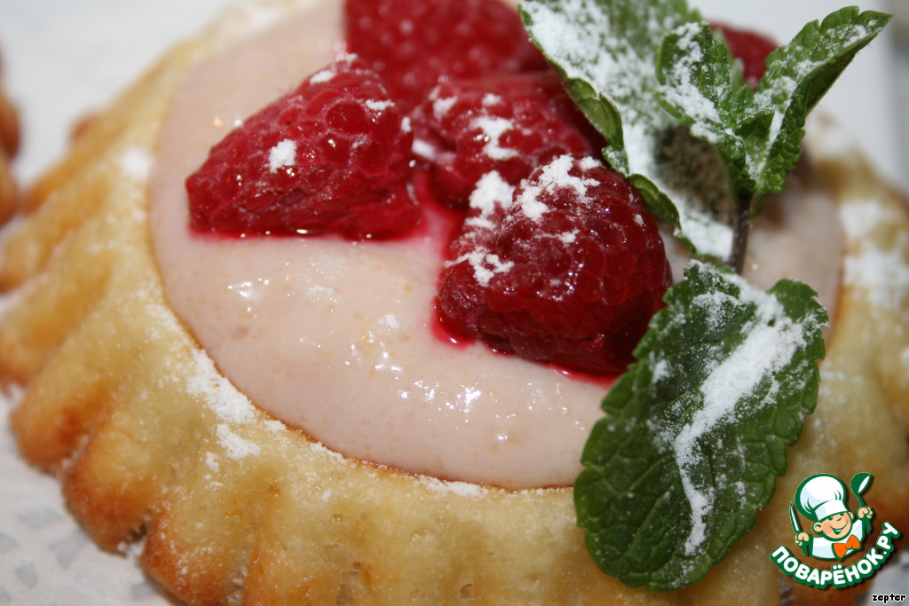 Затем разложить крем по тарталеткам, украсить малиной и листиками мяты, чуть присыпать пудрой.