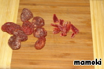 Возьмем цукаты... Какие? Да какие найдутся! Хорошо бы апельсиновые или лимонные, но если их нет, то и клубничные подойдут, например, а можно и манговыми побаловаться... Нарежем их кусочками небольшими... Вот так: