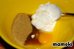Яйцо в миску разбиваем, сахар коричневый добавляем... Ой, у меня прямо стихи получились... И сметанку, ту, что пожирней, кладем. А теперь все это перемешаем, солью посыпаем... Смотри-ка, опять стихи получились!