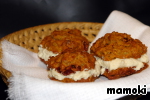 А пока кремом займемся. Возьмем творог домашний и с медом ароматным, жидким его перемешаем. Да вот незадача, жидковатый крем у меня получился... Пришлось желатин добавлять (замочить 2 чайные ложки желатина в кипяченой остывшей воде на 30 минут, нагревать до полного растворения, но не кипятить, процедить и добавить в крем, крем убрать в холодильник на 30 минут). Ну, а теперь, когда крем застыл наконец, смазываем плоскую сторону лепешечек и склеиваем их между собой попарно. Вот и все!