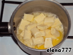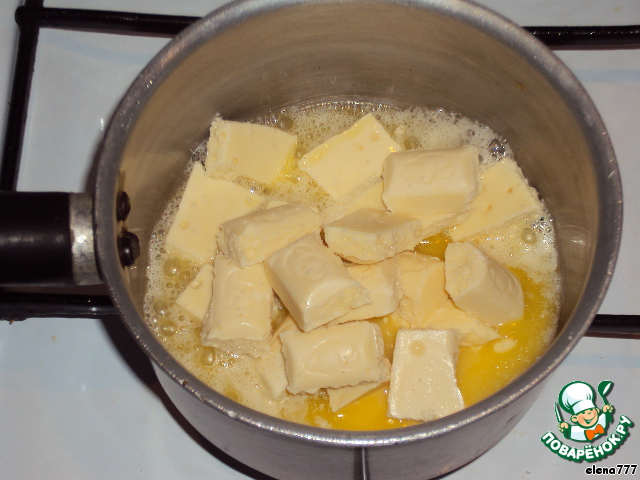 Пока остывает пралине, приготовим бисквит: растопить 100г сливочного масла, добавить 100г белого шоколада, поломанного на кусочки. Как только шоколад растопится, массу перемешать и снять с огня, дать немного остыть.